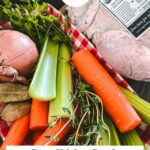 - Add 4 medium carrots (peeled and halved), 3 celery sticks (cut into thirds), 1 small yellow onion (halved and ends removed), 6 sprigs fresh parsley, and 4 sprigs fresh thyme. Softly simmer for an additional 1 ½ hours.